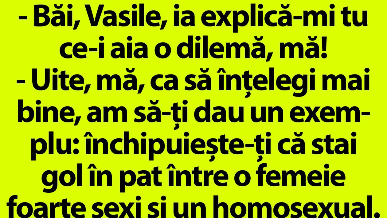 Ion urma sa se-nsoare. Taica-sau il ia deoparte si-l instruieste:– Vezi, baiete, dupa nunta trebuie s-o pui sa se dezbrace, sa dea jos budigaii si o sa vezi tu dupa aia…In fine, vine noaptea nuntii. Ion se rasteste la Maria:– Dezbraca-te, fa!Maria:– Aoleu, mi-e rusine.– Dezbraca-te, ca nu știu ce-ți fac!Maria se dezbraca.– Asa, acu … Read more
